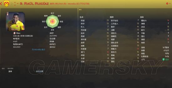 效力于墨西哥莫雷利亚君主(霸气的队名)的前锋,身材矮小,相对应的速度快,盘带好,射门高达16,精神属性也很不错。数据上看具备去欧洲五大联赛踢球的实力,非常实用的一名前锋。