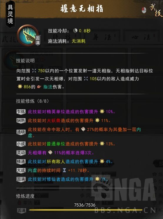 通过后面刷词条和技能组合发现就是要靠普攻叠debuff,然后绝技引爆减蓝,触发绝技的敌法效果,普攻也带烧蓝,基本就随便放了,前期条件触发苛刻,但是伤害很离谱,后面的图我这个金丹的神通能炸九尾狐一半血,配合双灵三灵天赋也很爽。