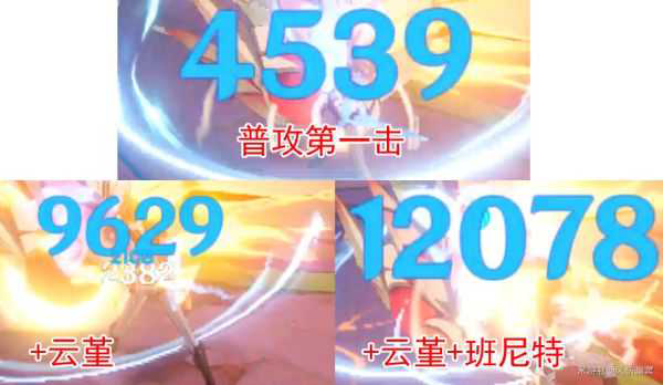 云堇对普攻有很高的提升,搭配达达利亚近战模式正好。图片都是用第一击测试的。
