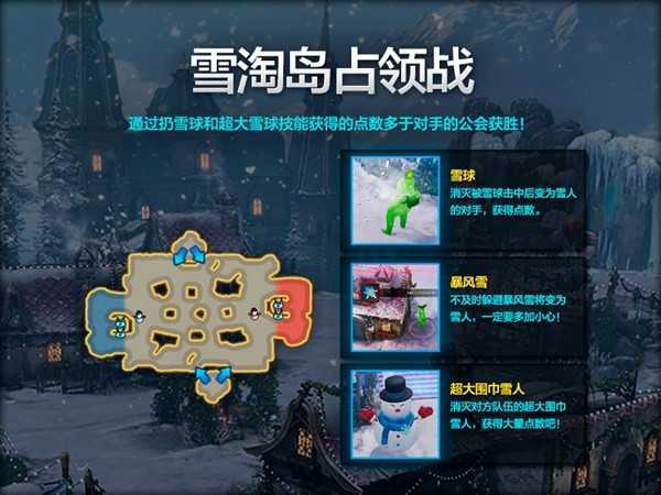 雪淘岛是雪球飞舞的战场,冒险家们将手持雪球,使用雪球砸向对手,命中并将其砸成雪人后,再次砸中对手即可将其击败,进而获得点数。