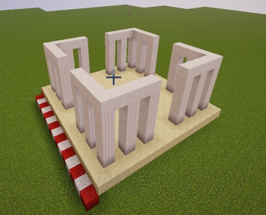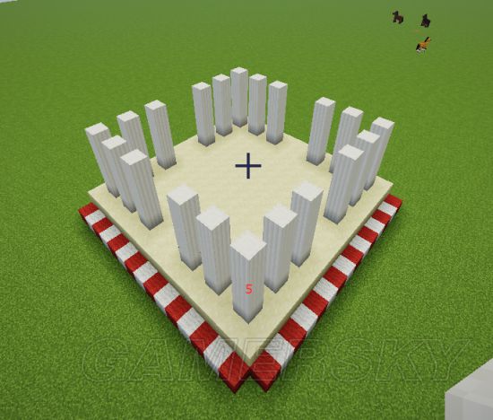 2、像这样做柱子,每个角三个,隔一格放一根柱子,柱子五格高。