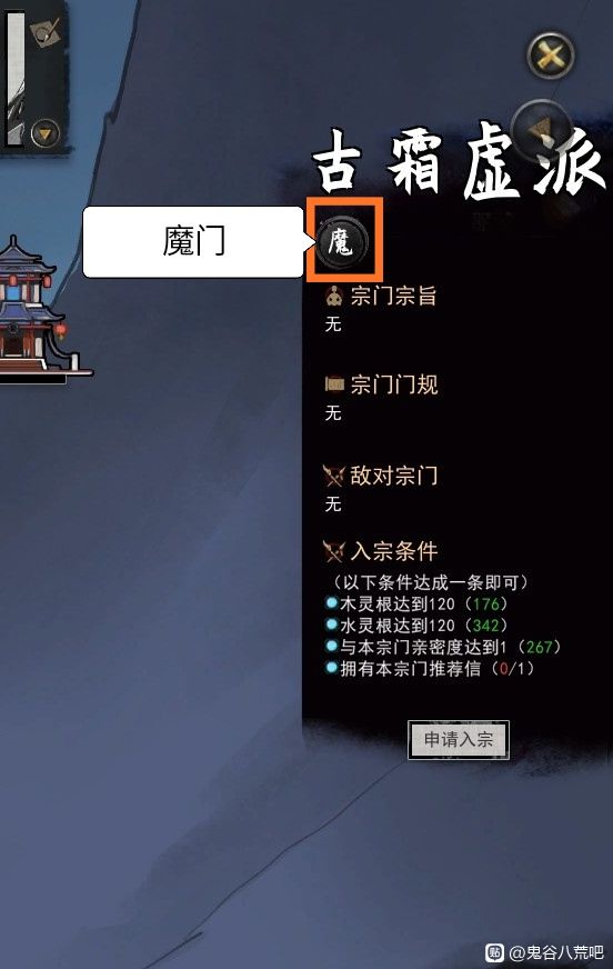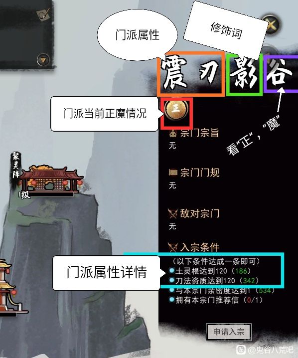门派名字前两三个字是和门派的主修属性相关联的,最后一个字是和“正魔”关联的。比如说“震刃影谷”,前两个字“震”和“刃”就对应了“土”和“刀”,想练刀和土的道友就可以进这个门派。最后一个“谷”字代表了这个门派是“正道”的。倒数第二个“影”字是的修饰词,可以忽略。