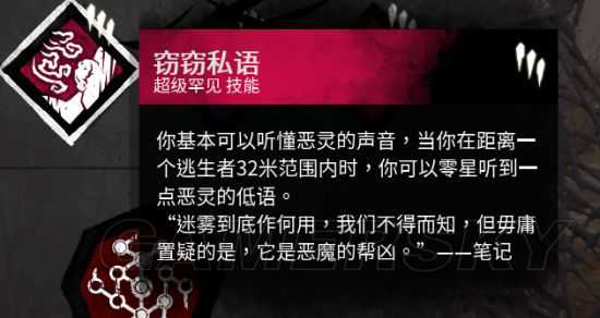 巧了,人类能听到的心跳距离就是32米。也就是窃窃私语一亮,人类那里已经有心跳的声音了。我屠夫是圆心,我的窃窃私语范围就是一个圆。。虽然范围很广,但是只要用蓝色扇面(屠夫视野)的范围去发现人类就可以。往哪边走亮就是走对了,突然灭了证明你走反了,赶快调整方向,划定一个大致范围。减少很多不必要的搜寻时间,巡逻电机,你走的那个方向压根就没亮,根本不用去搜。直接奔下一台电机。用的好,开局不到1分钟已经砍到(发现)人了。想要抓最后一个人,根本不用砍翻第三个人养猪。淡定的挂人,用窃窃私语去搜寻。
