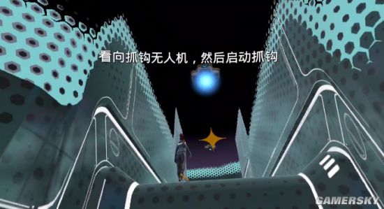 使用抓钩,到达新的位置:视角对准无人机,按住右手柄摇杆键,同时向前推