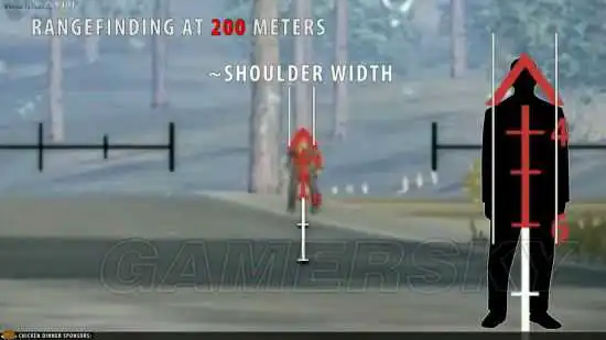 四倍镜是用三角和横线测肩宽,八倍是测身高,注:人和八倍镜下面第一条线400m那里其实应该是600m,400m和500m身高大概在八倍镜下第一条线到第二条线之间。