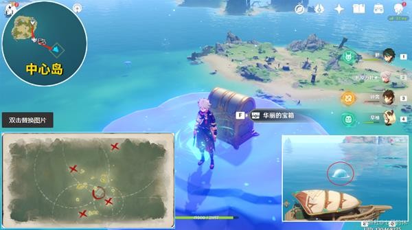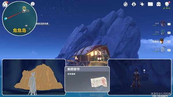 1. 危危岛西北方向的小岛,拿船往西南方向能看见一个礁石,往那边开,爬进礁石,开启元素视野,看到一个可以打碎的碎石堆(建议带双手剑角色),打碎看见普通宝箱,开启获得任务道具「航路留书」,并自动接取隐藏限时世界任务「四礁觅宝记」之宝藏线索·危危岛!