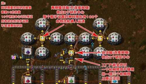另外注意正中央的绿色科技包工厂:为何出货用的机械臂不像左右两个红蓝工厂那样放在正中间?因为它在那个位置放上去的科技包偶尔会卡住传送带...