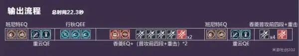 由于元素反应机制,火打水只消耗一半的水附着量,因此香菱的弱火攻击每次只会消耗一半的行秋的弱水附着。换句话说行秋上一次水可以供香菱触发两次蒸发,因此能够保证香菱的技能全程蒸发,而不会打乱元素反应变成水打火。香菱的元素战技锅巴共喷4次火,大招风火轮可造成11次伤害(4命),这些伤害全部没有上火CD,因此全都能触发蒸发反应。行秋的上水来源为Q技能产生的飞剑和围绕身体的护体剑,两者都能产生水附着,因此上水频率很快。