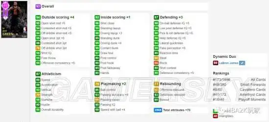 本次还更新了两组DUO,但很多人满心期待的热火时期詹韦连线并没有出现,不过这张杰夫格林确实在DUO后属性增长不少,从原本的93紫成长为95钻。