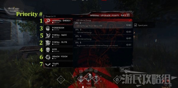 为了最大限度延长附身精英单位Demi-Eligos的时间,建议优先提升能量(Infernal Energy)、传送门-精英(Portal: Elite)和附身(Possession)三种能力。这些基本上在前期都能点满,当然前期也是最理想的攻击时间,可以持续打骚扰不给幸存者发育时间。
