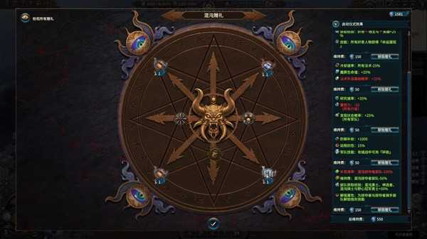 然后是混沌赠礼,这个就是混沌勇士派系的全局BUFF系统了。其效果包含了从领主到军队的经验获取、补员、额外的面板技能、特定的恩赐部队等等方方面面。混沌赠礼的效果有强有弱,会随着游戏中获取灵魂的总量逐步解锁。每次启动混沌赠礼时需要消耗一个固定的灵魂值,之后每回合还需要消耗灵魂来维持。效果越强大的赠礼消耗就越高。所以在早期时不一定能保持常驻。通常来说,赠礼会依据所选神祗最多同时启动4个单一邪神专属Buff和3个统合Buff。但如果本身就是统合派的混沌勇士则可以启动每个邪神各2个也就是8个专属和3个统合效果,当然灵魂消耗量也就要增加很多了。一部分科技会根据启动的赠礼数量带来特殊的全局Buff,同时当在赠礼上消耗的灵魂量到达一定程度后可获得‘邪神注目’的弹窗事件并获得一定的好处。总的来说,赠礼系统对于玩法还是比较重要的。比如可以在游戏早期得到一些比较强力的单位。但是相较其他派系的全局Buff系统也谈不上特别独特。