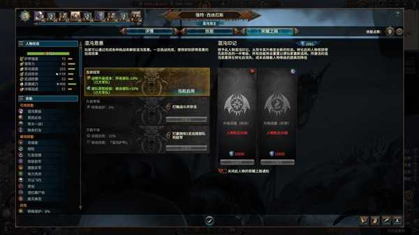 当然,既然咱是邪神钦定的勇士。好处也不仅仅局限于军队方面。首先在领主方面,每一位传奇领主都可以拥有一部分与战锤3正传战役中的大魔一样的邪神机制。比如阿扎泽尔可以魅惑敌军,维里奇可以使用万变之道。但是效果会打一些折扣比如维里奇就不能使用城镇交割。此外,更多体现这些神选凡人和大魔之间区别的则要通过一些其他的机制。首先是荣耀之路系统。大家也都知道混沌勇士是一个信邪神的凡人派系。那么除了已经赢得了邪神恩赐的传奇领主之外。阵营中的其他人物们要如何得到邪神的注意呢?当然是和小兵一样通过奋勇战斗来向上攀升咯。混沌勇士派系中的普通领主和英雄都可以被赐予‘混沌印记’,通常来说到达5级之后即可通过向一位邪神献祭上一定的特殊资源‘灵魂’来赢得邪神的恩惠。顺道一提,灵魂是属于混沌勇士派系专属资源,可以通过击败敌军或是毁灭城镇来获取。需要注意的是灵魂只能从凡人阵营身上获取,击败恶魔是不会得到灵魂的。所以简而言之就是:杀人。那么,在以某个角色完成了灵魂献祭之后。该角色会丧失一部分等级,但会得到属于所献身的邪神的印记即该邪神的加成buff,比如恐虐就是狂暴、奸奇就是护盾等等。法系职业也能在献身时得到一次更改法术学派的机会。此外,对于领主而言。到了30级之后甚至可以通过这个系统抛弃肉身,升魔成为恶魔亲王。当然,等级会降低不少,但也能获得恶魔躯体以及其所带来的的如飞行和恐惧这样的一系列优势。同时,荣耀之路还包含了另一个‘混沌恩惠’,可以通过完成特殊的条件如打赢对特定敌人的战斗来获取独特的主动/被动技能。这些可看作‘转职’或是‘个人任务’的玩法,对于缓解后期游戏地图涂色时的无聊起到了一定的缓解作用。