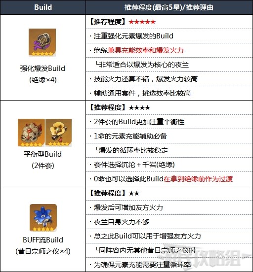 平衡型的Build很难保证充能效率,建议搭配夜兰的1命效果「元素战技使用次数+1」使用。如果无论如何也只有0命夜兰的话,选择「沉沦+绝缘」的组合爆发循环会更加稳定。
