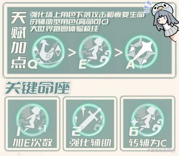 释放[元素爆发]后可恢复并持续恢复全队角色的生命值。同时提升场上角色8次跳跃能力,若借此释放[下落攻击]将减少一次次数并同时造成风元素范围伤害。