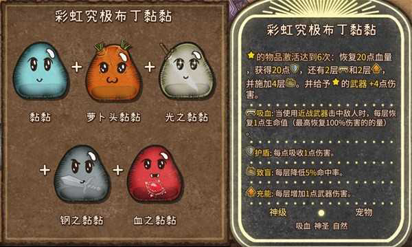 2.彩虹究极布丁黏黏(神级,吸血,神圣,自然,宠物):黏黏+萝卜头黏黏+光之黏黏+钢之黏黏+血之黏黏