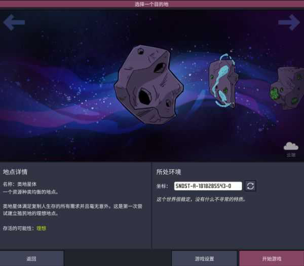 因为是纯萌新向的,所以这里只推荐第一个,类地行星,如同描述,资源种类均衡的地点,前期藻类制氧可以撑很久,煤炭发电能用300个周期以上,出生点水很多,全图冰区冷地底热,食物种子不算太难弄,总之是一个可以把前期过的很久的行星,萌新必备。