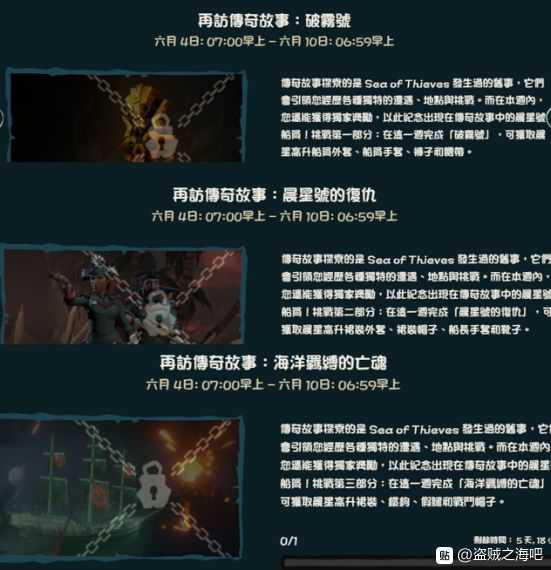 盗贼之海新活动,在六月十号之前再完成一次破雾号,晨星号的复仇和海洋束缚的亡魂即可获得晨星号全套衣服。限时活动,各位老船长可以多带带萌新做下。