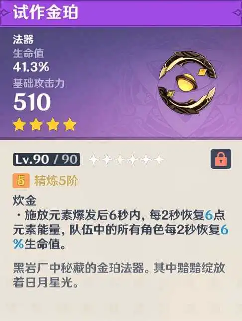 90级精5试作金珀拥有41.3%生命的基础值,特效为装备者开大后为其在6秒内回复共18能量,并为全队回复共18%生命值。