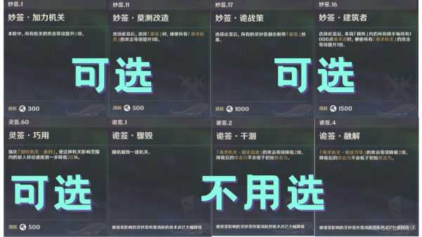 妙签主要选这几个即可,诡签这3个不用选,其它的随意,随机摧毁一座机关,500点的选不划算,诡签只减一半奇术点,1000或1500的可以选。