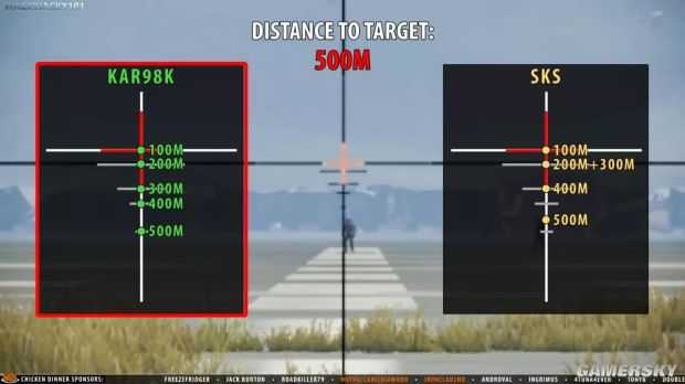 500米的距离,98k使用第四格瞄准,而sks使用第三和第四格中间进行瞄准。