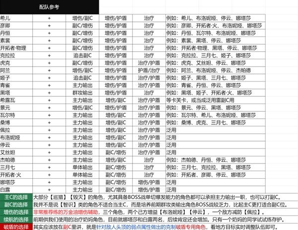 其实就是【主核】+【破盾副手/增伤】+【增伤/护盾】+【续航奶妈】这个公式,看情况再调整一下就行。只要你的主核角色养得好,多备几个破盾副C,前期开荒几乎都是没啥问题的。