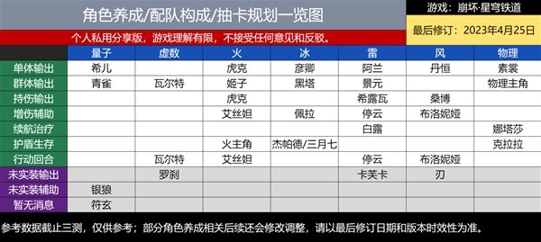 开荒期我希望大家还是老老实实养一些实用的“国家队”高泛用角色,等实现练度自由后随便你们XP是什么都行,随便养,回合制游戏的最终形态就是:闭眼推图,练度碾压。
