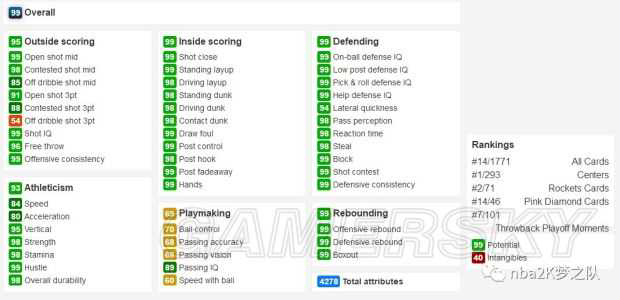 粉钻奥拉朱旺的属性总分为4278点,要高于粉唐斯和粉上将,是目前总分最高的中锋!投篮能力方面,中投99满分,背转身投篮99满分,空位三分也顺利突破90大关,搭配一双三分钻鞋也可达到99,是一名极为优秀的空间性中锋。大家可以来欣赏一下“大梦”美如画的后仰跳投,难怪有人称他为:打五号位的乔丹。
