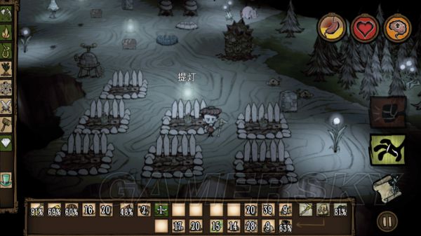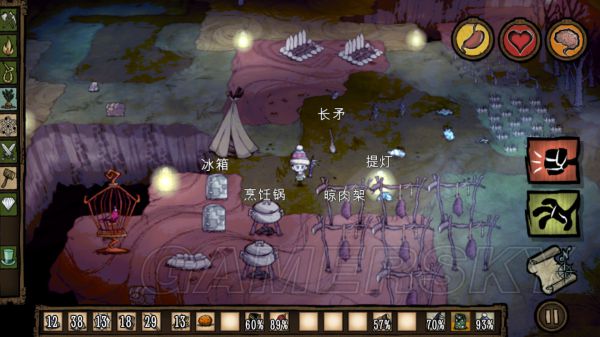 荧光果:洞穴的很多地方都有产出,其中沼泽最密集,分为一花,二花和三花。其中一花的一天重生,二花三花更慢。荧光果可以用来给狂化猪人换便便。可以给矿工帽充能(每个20%),还可以制作提灯,利用提灯BUG(单机模式下把一个新的提灯放在地上然后保存退出,重进)为你的营地提供永久性照明。