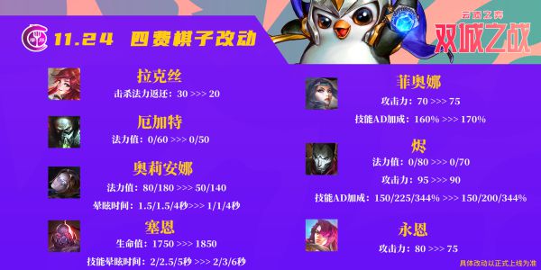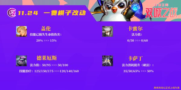 卡蜜尔:削弱,最大法力值增加10点,技能释放频率降低,进而导致坦度与续航能力略有下降,影响阵容赌老鼠。