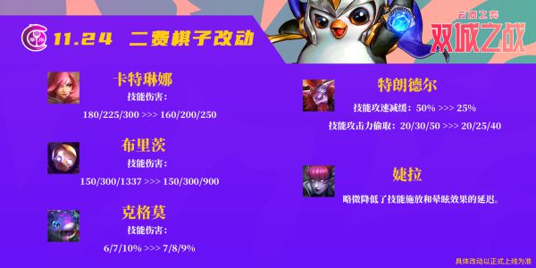特朗德尔:大削弱,特别是降低敌方攻速直接降低刀25%,现在巨魔对永恩得克制力度有限,而偷取攻击力也全等级降低,赌巨魔阵容的后期强度大幅度下降。