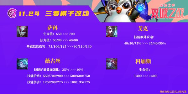 艾克:削弱,友军获得攻速增益降低,特别是3星直接砍了1/3,强度下降较为严重,对刺客阵容与挂2/4极客阵容影响较大。