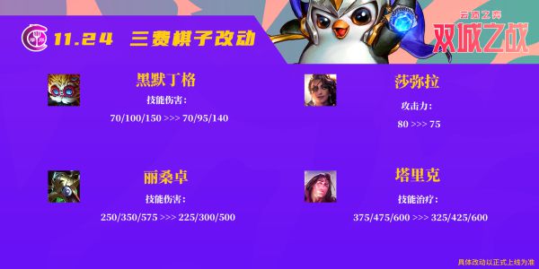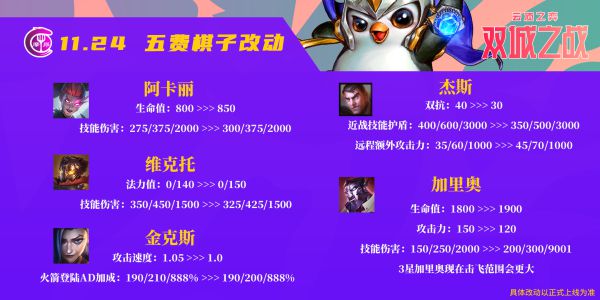 加里奥:调整,生命值增加100,极大增加了加里奥的肉度,但加里奥的攻击力遭大砍,大家知道加里奥普攻还对目标周围棋子造成魔法伤害,降低了30点攻击力,最少一次普攻价格低60伤害,削弱极大。而增强1-2星技能伤害,对加里奥提升不算明显,加里奥的输出更多来源于普攻。
