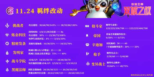 炼金科技:技能大调整,现在羁绊效果持续时间固定8秒,攻速与回血则跟着羁绊数量增加,怎么算都是增强,8秒的降低25%减伤,让炼金棋子变得更肉,坦度大幅度增强,攻速与续航与之前相比略低,但持续时间提升刀8秒,也谈不上不算削弱,只是少了一些爆发。而5/7/9羁绊则均属于大增强。这对炼金狼阵容提升较为明显。