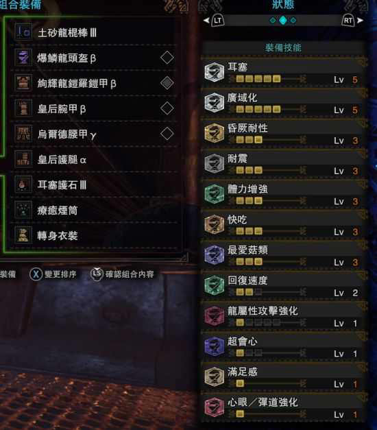 属性解放后的土砂片配装,可以看出相对少了耐震和几级一级技能,这套打打普贝还是可以的。