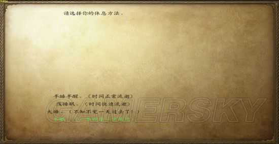 这个可以用来适应各种休息需求,比如有些玩家喜欢不参与看各国之间对战,那么不可能一直呆在电脑面前看,很费时间。而去修改城镇休息时间流逝速度又很麻烦,用完了想再正常还要再调回来。这个TXT就是多加了一个菜单,很简单的一个修改,但效果意外的不错呢。