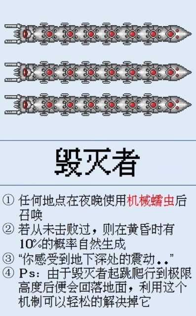 《泰拉瑞亚》肉山后的BOSS强度大幅提高,其中毁灭者是一个肉山后的BOSS,想要了解召唤方式的玩家请看下面“不过如此太阳”带来的《泰拉瑞亚》毁灭者召唤方法,希望能够提供帮助。