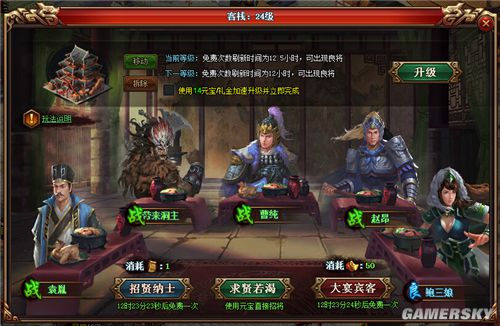 客栈招募名将是最为简单的方式,只要玩家的城池中建有客栈就能使用。招贤馆中分为招贤纳士、大宴宾客、求贤若渴三种,其中求贤若渴可以花费一定元宝直接招募蓝将或紫将。