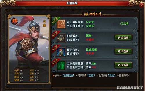 而通过名将录结交将领的难度,则是需要达成一定条件,名将录中收录了近百位名将,蓝色、紫色、橙色表示良将、名将、神将,其中神将属于全服唯一。想要结交武将,玩家需要拥有相匹配的爵位,满足幻境城池条件,打通世界城市,并且还要赠送特定宝物,才能真正结交神将,将其收入麾下。