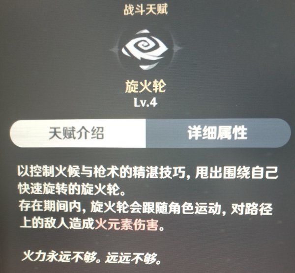 大招,首先先挥舞长枪造成三段范围伤害并且唤出一个火轮围绕自己旋转10秒钟。对碰到的敌人造成火焰伤害和附加火元素属性。一个范围aoe,在打冰冻史莱姆的时候你就知道有多快乐了,配上锅巴的减抗,伤害直接芜湖起飞。
