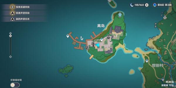 大地图上购买点看蓝色尖头,就是角色当前所在地点。