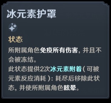 该护盾存在期间, 会对所附属角色提供 2 次冰元素附着, 元素附着次数消耗殆尽后, 冰元素护罩随即解除。