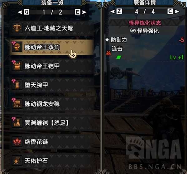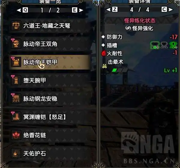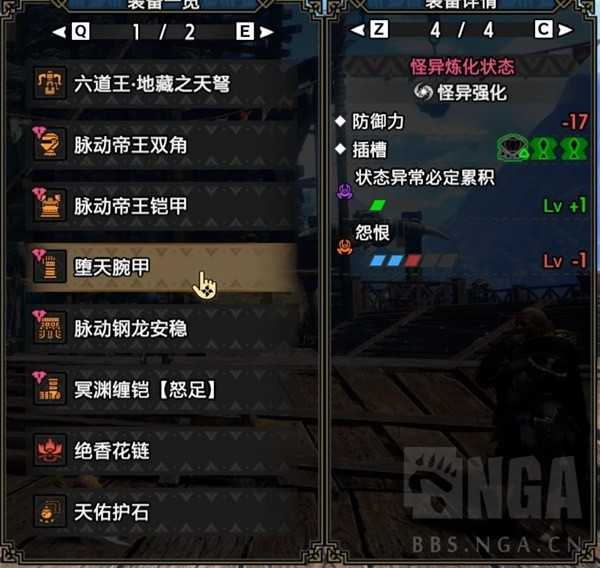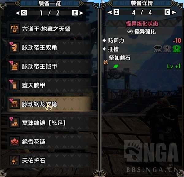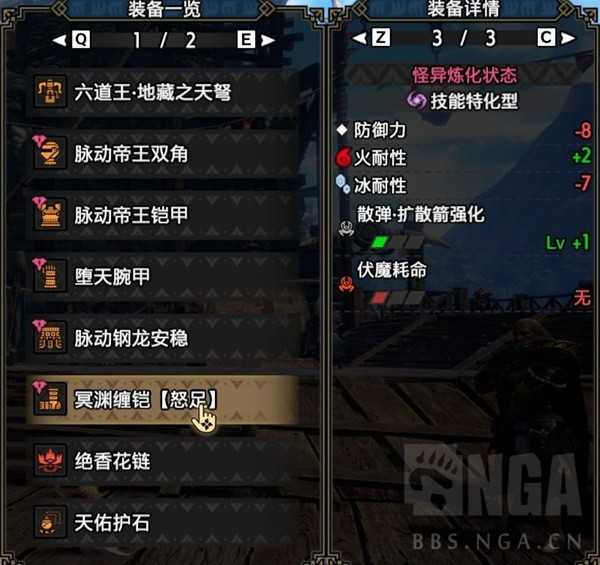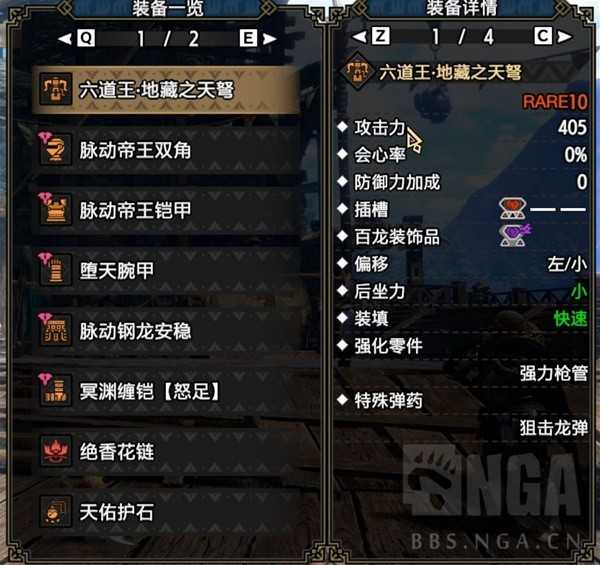 武器的选择是天狗兽重弩。看了一圈重弩里面,基本上只有刚缠兽重弩和天狗兽重弩在放散3方面比较亮眼。刚缠兽重弩面板极高而且孔位非常优秀,走射放散3。但是刚缠兽重弩的问题在于不出零件改造的话装填没法修到最快。而天狗兽重弩是唯一一个可以做到走射走填放散3的重弩,而且它的面板和孔位也算是平均水平,因此我选择使用天狗兽重弩。天狗兽重弩需要1级抑反和3级装填,偏移不需要管。
