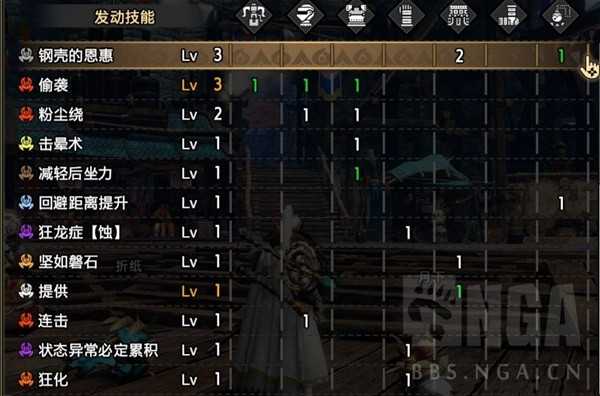 核心增伤技能是攻7,超心,散弹强化,偷袭3,粉尘绕2,连击1。会心靠弱特3,狂龙1,和看破6,可以堆到100会心。核心生存技能是狂化1,搭配钢壳3,体力回复量提升3,以及超回复力团子lv4+团子医疗术3,可以保持蓝书状态下以极度缓慢的速度掉红血。吃一口活力剂可以让红血缓慢上涨。注意,未克服狂龙症的时候红血下降速度会很快,但是也不至于掉光,一般掉个30%红血左右的时候就可以克服狂龙症。克服狂龙症的时候会直接把红血条回满,然后红血就不会掉了。