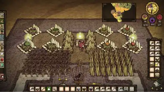 制作的流程也比较科学:避雷针定位后先是科技和火堆然后科技往上数八格种作物两边对称放好后正好会留下一个格子放鸟笼(此时魔法二本还没有放)。