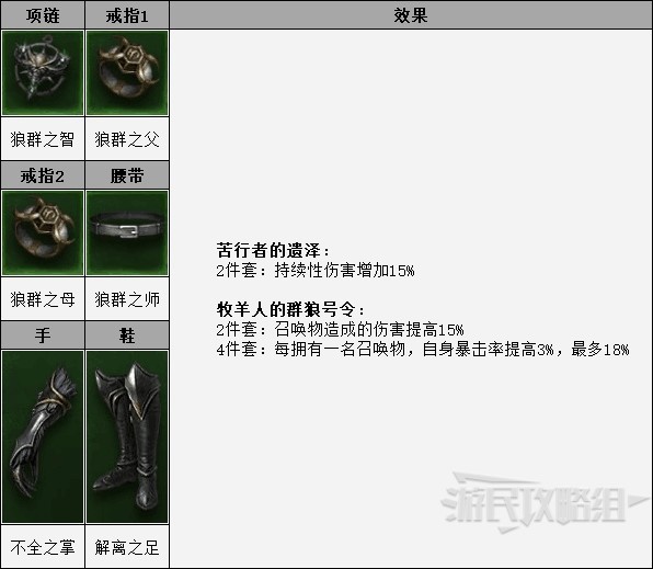 由于【苦行者的遗泽】的4件套无法为召唤物提供增益,因此2件套就够了,增加持续性伤害的能力也可以为「精魂引爆」提供加成。