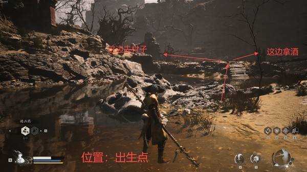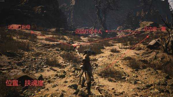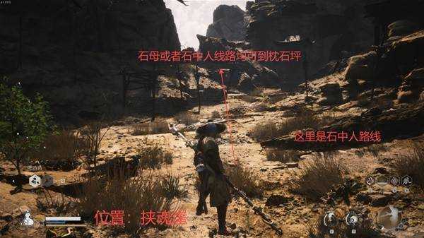 ④、⑤、⑥、⑦打完小怪来到【藏风山凹土地庙】→先收集四个【佛目珠】→在山沟尽头遇到石中人→去洞里打石母→在石母附近捡到第五个【佛目珠】→回去找石中人,打他一顿→回到土地庙调息刷新,然后就会自动解锁石中人商店→去找石中人买【醒酒石】→