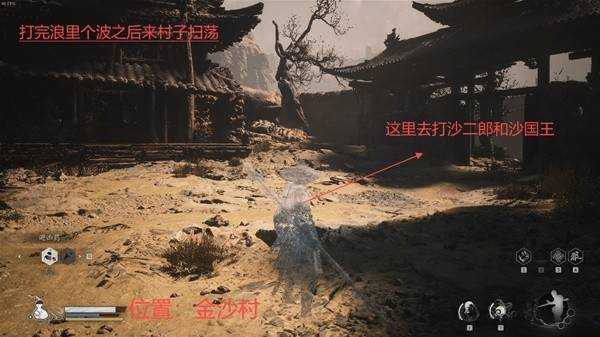 →丹方交给戌狗→戌狗附近亭子【打坐蒲团】→进入沙门村→大院子里打地狼→马哥被绑在亭子里→有人躲在房子里,提到三王子在西天佛国→