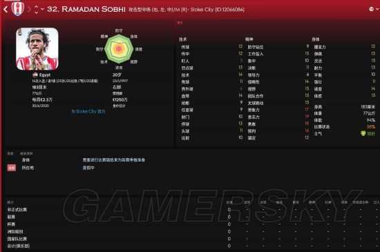 斯托克城的索比,CA134,是埃及能力值第三的球员,不出意外他也应该是萨拉赫在国家队的锋线搭档了,索比非常年轻,97年出生的他只有21岁。他并不是一个射手型球员,更像是一个组织者,有着非常不错的想象力(17)和视野(15),但射门能力很弱(10),速度也不快。虽然年轻,但他精神属性出色,意志力19,勇敢18。萨拉赫身边需要这样一位敢打敢拼的帮手。