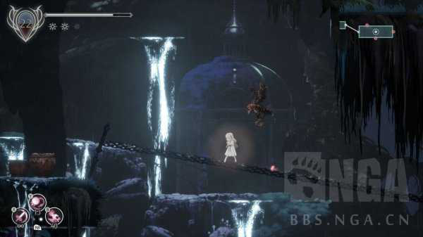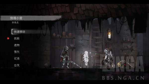 坐椅子(类似空洞骑士的设定)是存档、变更技能、变更饰品和传送的地点,比较有特色的点在于你当前使用的技能组关联的灵魂会出现在画面(上图的背后灵、修女和小孩),好评在于可以传送省去了很多跑图时间,差评在于饰品必须在椅子处换,有些僵硬