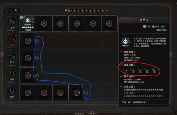 装上内功后,查看内功你会发现有一栏叫《功法栏位》,这个就是增加格子用的。